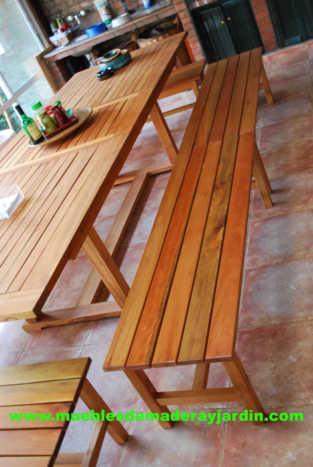 La mesa de madera con bancos sin respaldo, es una invitación a olvidar las limitaciones, sean del orden que fueren.